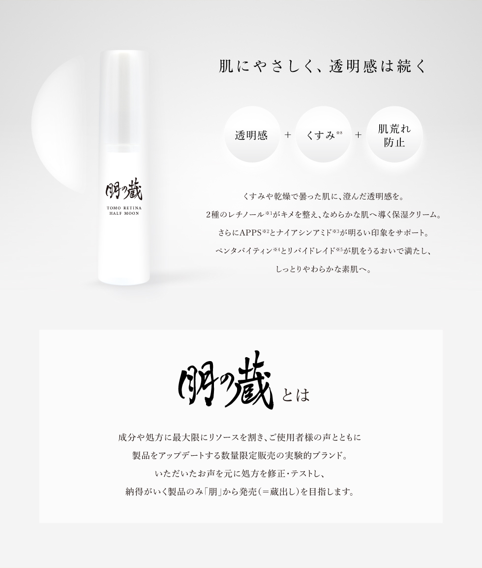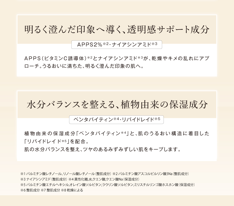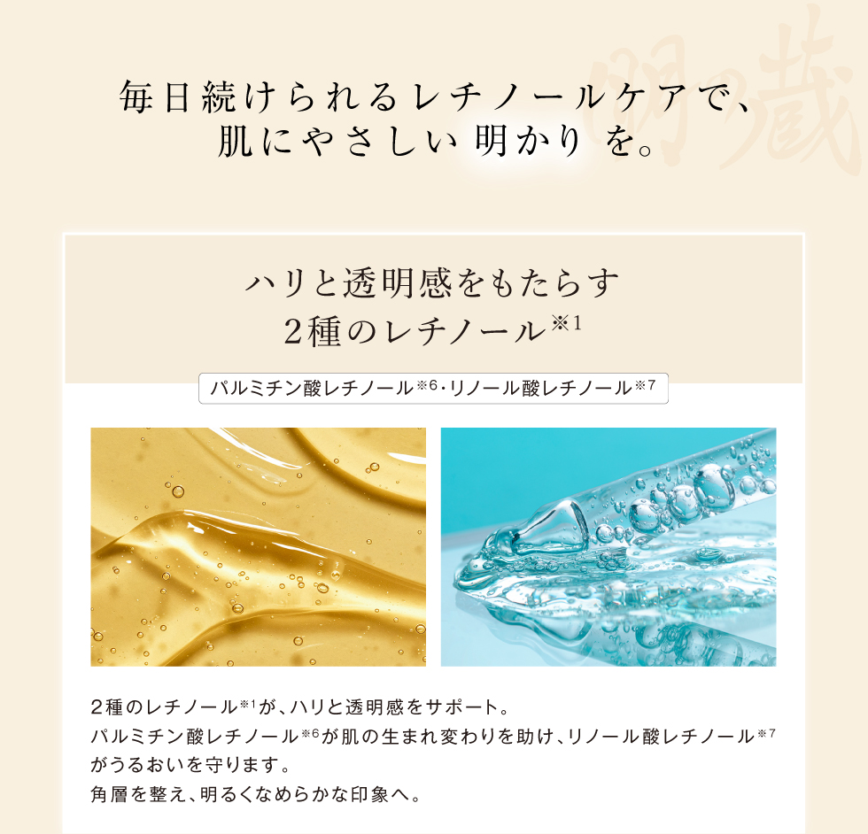 | 特徴 | いざ、みずみずしい透明感へ。 透明感+くすみ※8+肌荒れ防止 くすみや乾燥で曇った肌に、澄んだ透明感を。 2種のレチノール※1がキメを整え、なめらかな肌へ導く保湿クリーム。 さらにAPPS※2とナイアシンアミド※3が明るい印象をサポート。 ペンタバイティン※4とリバイドレイド※5が肌をうるおいで満たし、しっとりやわらかな素肌へ。 |こんなお悩みの方に □くすみ※8が気になる □毛穴の開きが気になる □うるおい不足 □キメの乱れ □乾燥によるごわつき 毎日続けられるレチノールケアで、肌にやさしい 明かりを。 |パルミチン酸レチノール※6・リノール酸レチノール※7 ハリと透明感をもたらす2種のレチノール※1 2種のレチノール※1が、ハリと透明感をサポート。 パルミチン酸レチノール※6が肌の生まれ 変わりを助け、リノール 酸レチノール※7がうるおいを守ります。 角層を整え、明るくなめらかな印象へ。 |APPS2%※2・ナイアシンアミド※3 明るく澄んだ印象へ導く、透明感サポート成分 APPS(ビタミンC誘導体)※2とナイアシンアミド※3が、乾燥やキメの乱れにアプローチ。うるおいに満ちた、明るく澄んだ印象の肌へ。 |ペンタバイティン※4・リバイドレイド※5 水分バランスを整える、植物由来の保湿成分 植物由来の保湿成分「ペンタバイティン※4」と、肌のうるおい構造に着目した「リバイドレイド※5」を配合。 肌の水分バランスを整え、ツヤのあるみずみずしい肌をキープします。 |パラベンフリー、エタノールフリー、合成香料フリー、合成着色料フリー、小麦由来原料フリー ※1 パルミチン酸レチノール、リノール酸レチノール(整肌成分) ※2 パルミチン酸アスコルビルリン酸3Na(整肌成分) ※3 ナイアシンアミド(整肌成分) ※4 異性化糖,水,クエン酸,クエン酸Na(保湿成分) ※5 パルミチン酸エチルヘキシル,オレイン酸ソルビタン,ラウリン酸ソルビタン,ミリスチルリンゴ酸ホスホン酸(保湿成分) ※6 整肌成分 ※7 整肌成分 ※8 乾燥による |