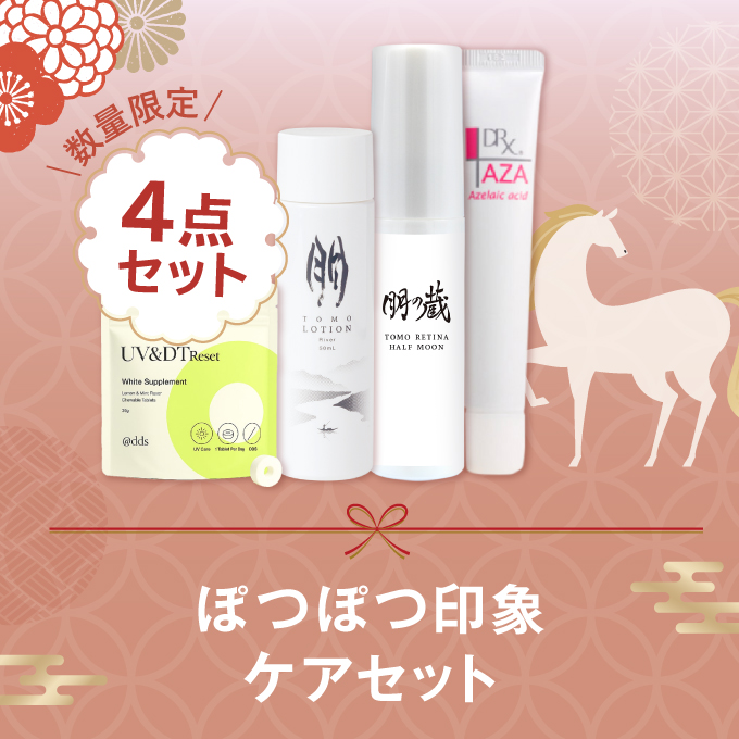 | 内容量 | ・朋トモローション ・朋の蔵トモレチナ ハーフムーン※数量限定品 ・DRX AZAクリア ・@dds UV &DTリセット ホワイトサプリメント 各1点 合計4点セット |