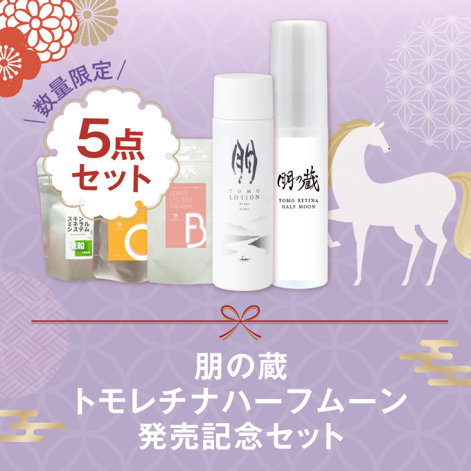 | 内容量 | ・朋トモローション ・朋の蔵トモレチナ ハーフムーン※数量限定品 ・スキンミネラルシステム ・スキンBシステム ・スキンCシステム 各1点 合計5点セット |