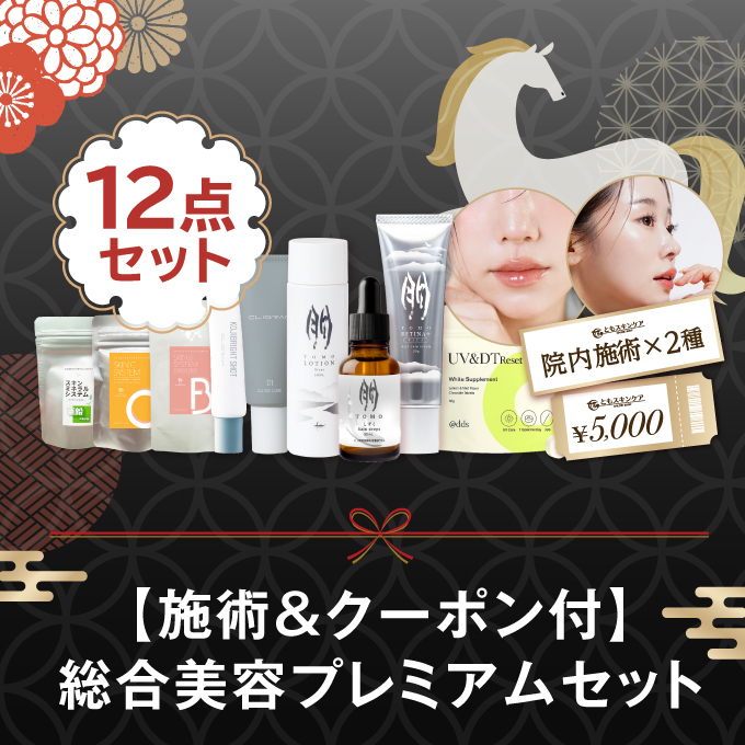 | 内容量 | ・[院内施術]ザーフ100s or HIFU(マリオネット) ・[院内施術]ヒーライト ・5,000円金券 ・朋トモローション ・朋トモレチナプラス ・朋しずく(30ml) ・カリグラム コジブライトショット ・カリグラム オールデイガード ・スキンミネラルシステム ・スキンBシステム ・スキンCシステム ・@dds UV &DTリセット ホワイトサプリメント 各1点 合計12点セット |